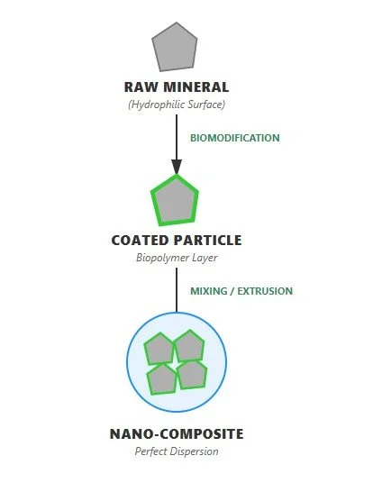 How does it work? The technology involves generating an ultrathin, amphiphilic biopolymer layer directly on the mineral surface. This layer acts as a "molecular bridge" between the hydrophilic mineral and the hydrophobic polymer matrix.